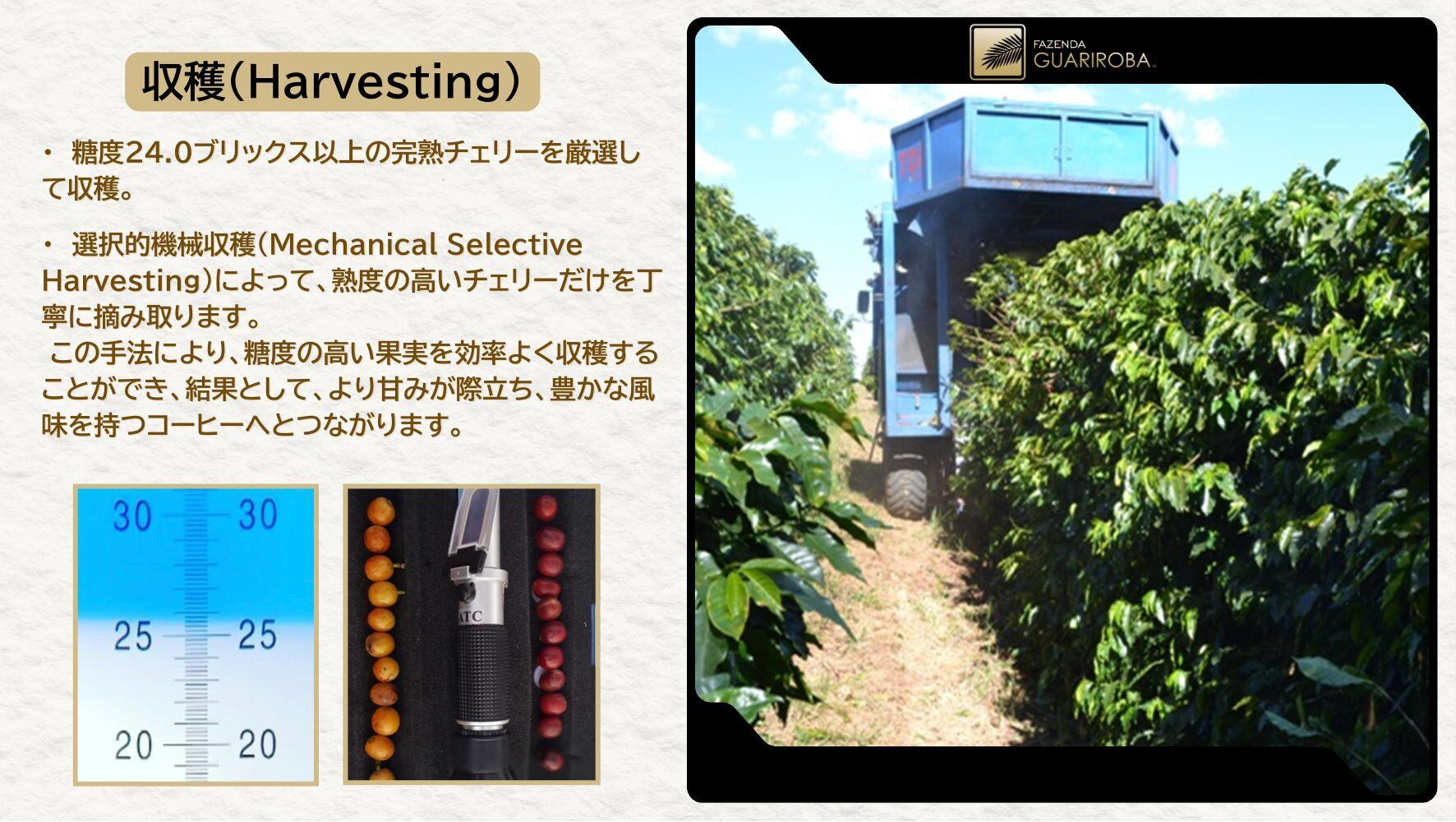 グアリロバ農園では、高性能な機械収穫(Mechanical Harvesting)を導入し、熟度の高いチェリーを中心に丁寧に摘み取ります。高精度な機械と熟練の管理によって、糖度24.0ブリックス以上の完熟果実を効率よく収穫。これにより、果実本来の甘みが際立ち、風味豊かでクリーンな味わいを実現しています。機械化と品質へのこだわりを両立させた、グアリロバならではの精密な収穫技術です。