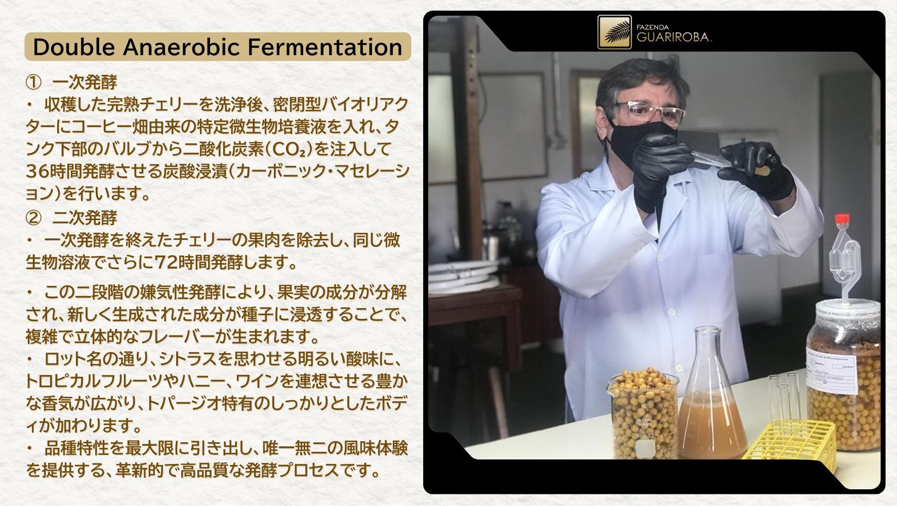 トパージオ・ダブル・ファーメンテーションは、グアリロバ農園を代表する目玉ロット。