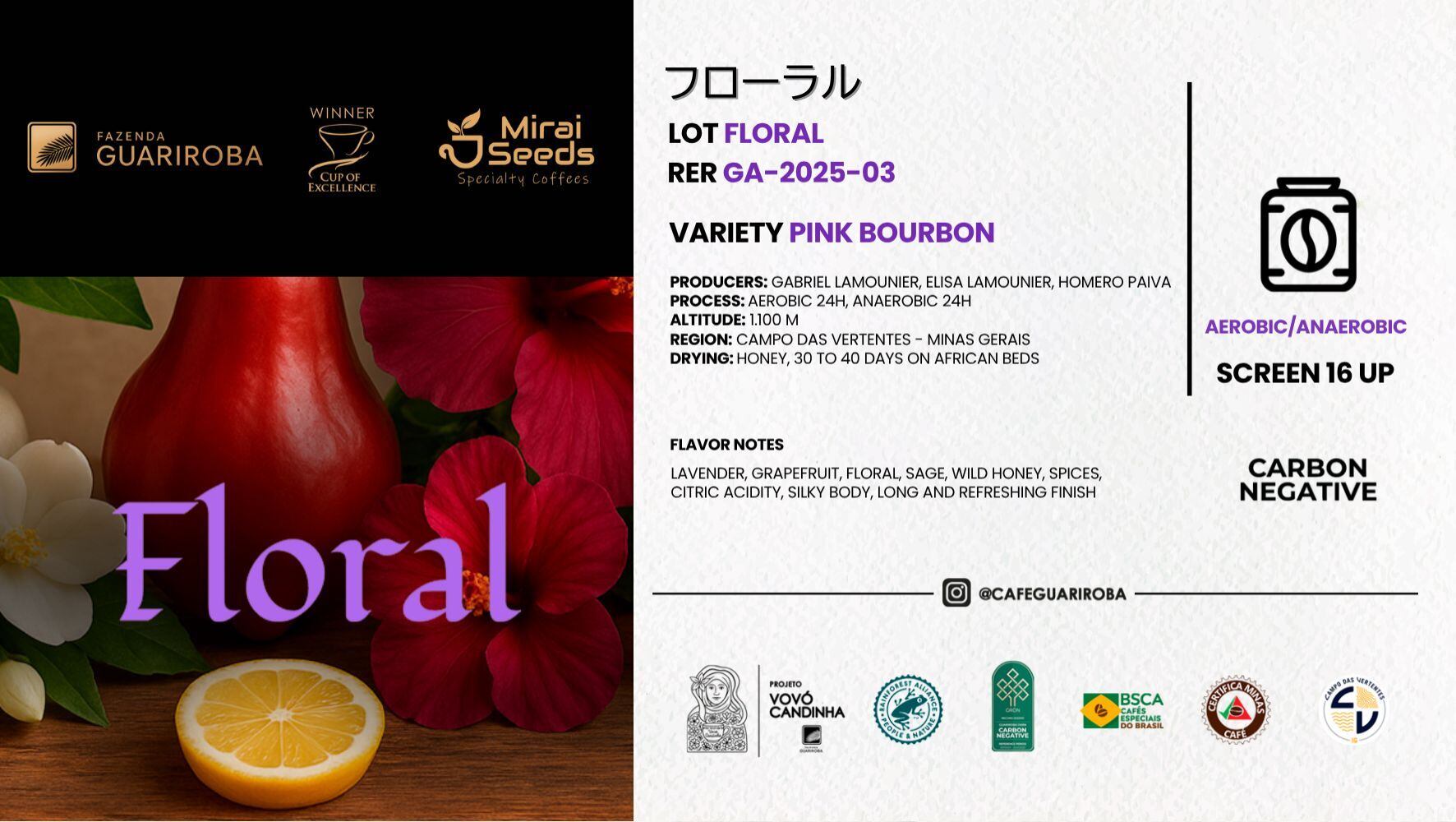 19世紀創業のグアリロバ農園は、5代にわたり受け継がれる名門農園。ミナスジェライス州カンポ・ダス・ベルテンテス地区(GI認定産地)で、伝統と革新を融合させたスペシャルティコーヒー生産を行う。カーボニック・マセレーションやアナエロビックなど先進的発酵技術を導入し、テロワールを生かした高品質なコーヒーを世界へ届けている。