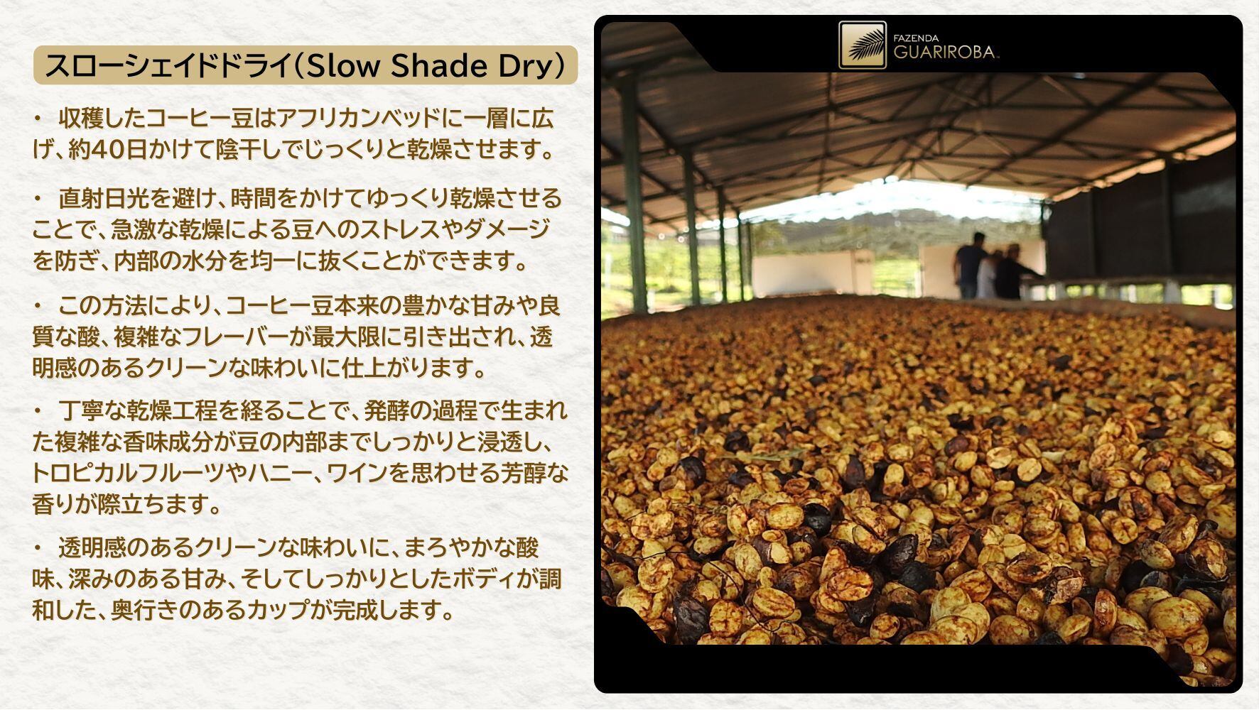 このスロー・シェイド・ドライ方式によって、発酵過程で生まれた複雑な香味成分が豆の内部までしっかりと浸透し、